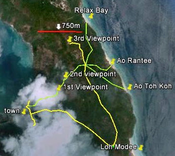 The eastern highland area also has a few walking tracks - it is possible to walk from town to several viewpoints and from there to the east coast beaches. It is also possible to walk from Long Beach to the viewpoints. The walks have some pretty decent slopes, some are a bit indistinct (eg the track into Loh Bakeo) and I would not do town to the east coast resorts with a pack or at night. I have a section on trekking and a trek map down page.